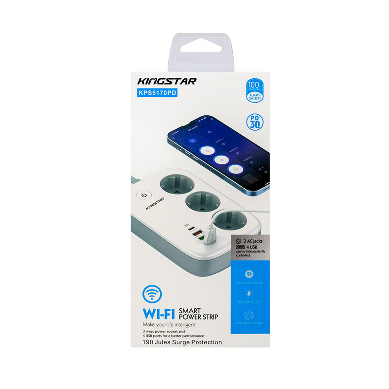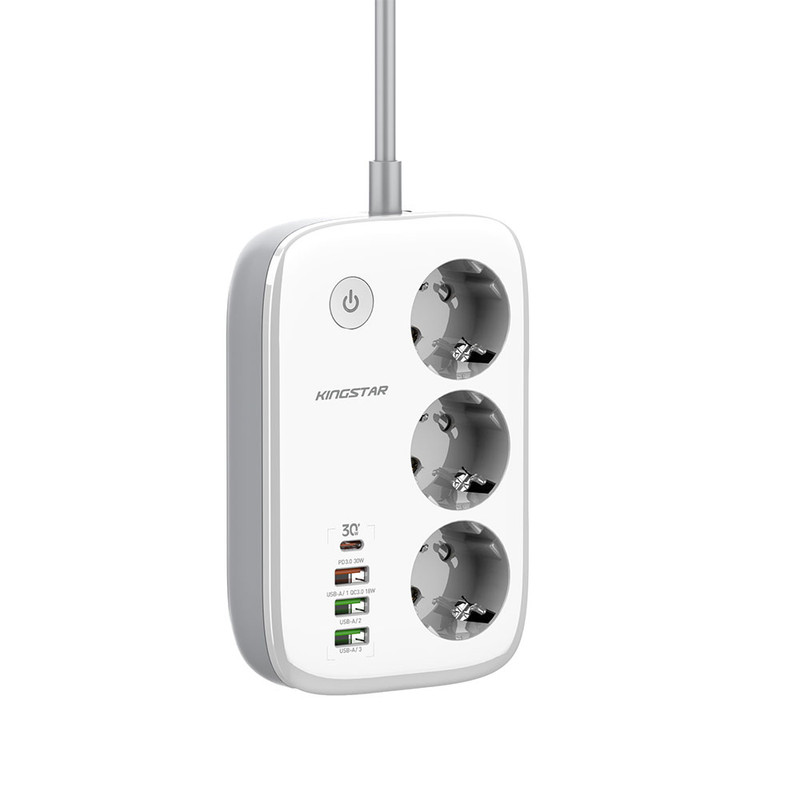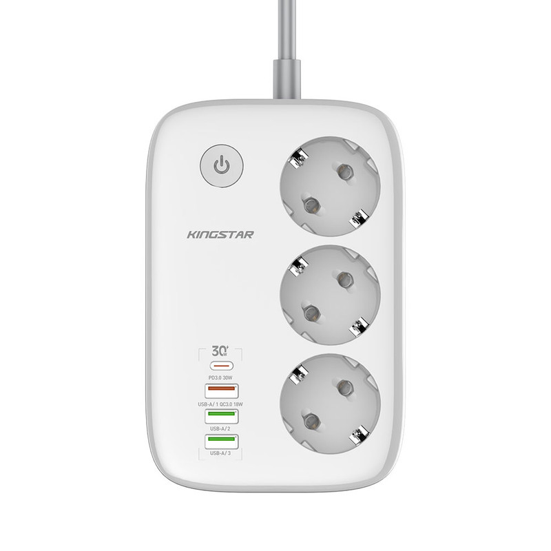 چند راهی برق کینگ استار مدل KPS 5170 در ابعاد 155x105x40 میلیمتر و وزن 440 گرم قادر است خروجی یک پریز برق شهری را به 3 پریز برق، 3 پورت USB و یک پورت تایپ سی (Type-C) تبدیل کند.
