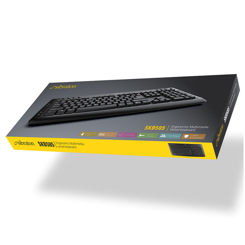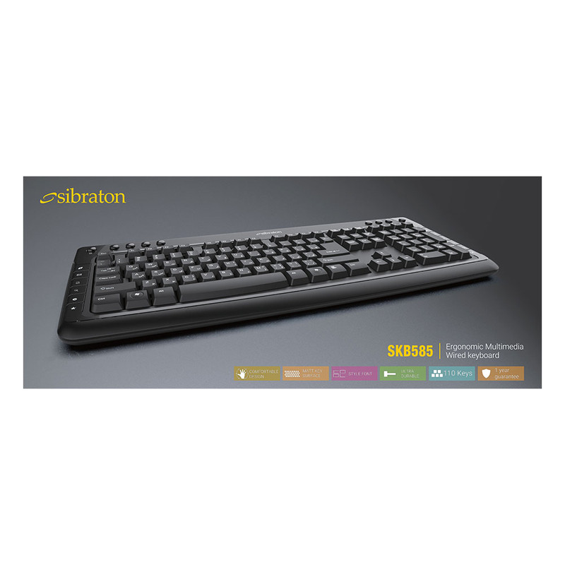 کیبورد سیبراتون مدل skb585 از نوع سیم دار میباشد و از طریق درگاه USB به کامپیوتر متصل میشود. این کیبورد دارای 110 کلید برای انجام فعالیتهای کامپیوتری است. همچنین کیبورد skb585 دارای 21 کلید میانبر به منظور انجام سریعتر کارهاست که عبارتند از Mute, Refresh, Music, Volume , Next Track, Pre. Track, Play/Pause, Stop, Web Home, email, My Computer, Favorite. کیبورد سیبراتون مدل skb585 برای استفادههای روزمره مناسب میباشد. از دیگر ویژگیهای این کالا، طراحی کلیدها به گونهای که امکان تایپ کردن در مدت زمانی طولانی را فراهم می کند، دسترسی راحت به تمامی کلید های کاربردی، طراحی نرم و سایلنت کلید ها، با دوام و دارای کلید های مات میباشد.