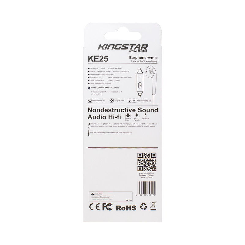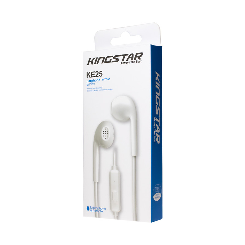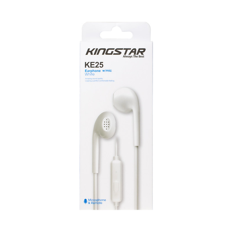 هندزفری مدل KE25 محصولی از کمپانی کینگ استار است که میتواند هر کاربر خوشسلیقهای را به خود جذب نماید. برای این مدل، یک میکروفون در نظر گرفته شده است تا کاربران قادر به مکالمه با موبایل خود باشند. همچنین یک عدد دکمه برای قطع و وصل کردن صدا در آن تعبیه شده است. با این دکمهها میتوانید به تماسهایتان پاسخ دهید یا مکالمه را قطع کنید.