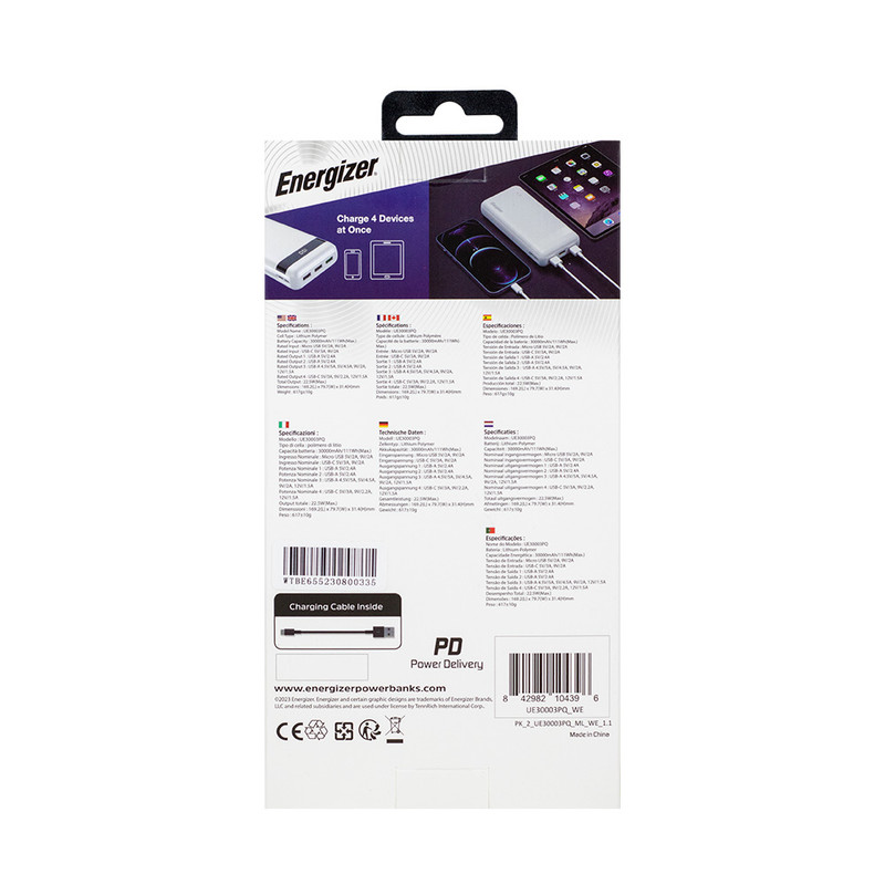 پاوربانک (Power Bank) مدل UE30003PQ از سری پاوربانکهای 30000 میلیآمپر ساعت شرکت انرجایزر به منظور شارژرسانی سریع به تلفنهای هوشمند با سیستم عامل اندورید و iOS و تبلتها تولید شده است. پاوربانک UE30003PQ دارای 5 پورت است که شامل 2 درگاه ورودی و 3 درگاه خروجی است. پورتهای ورودی به همراه نرخ ولتاژ و جریان آن عبارتند از: یک ورودی 5V/2A: micro-usb و 9V/2A پورت ورودی USB-C (پورت مشترک ورودی و خروجی): 5V/3A و 9V/2A پورتهای خروجی این کالا به همراه نرخ ولتاژ و جریان آن عبارتند از: دو پورت خروجی usb ساده: 5V/2.4A پورت خروجی usb با بکارگیری فناوری پاوردلیوری: 4.5V/5A و 5V/4.5A و 9V/2A و 12V/1.5A پورت ورودی USB-C (پورت مشترک ورودی و خروجی): 5V/3A و 9V/2.2A و 12V/1.5A