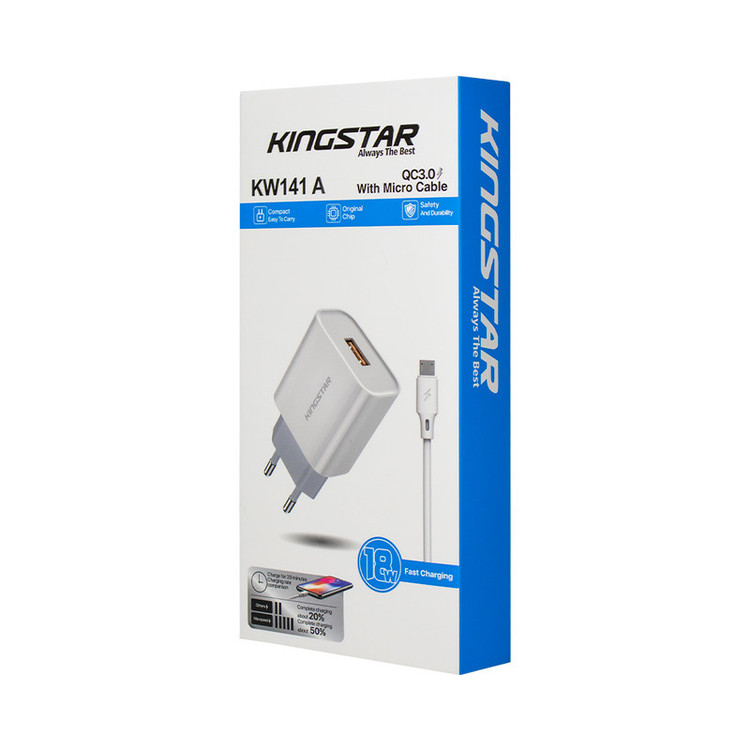 با استفاده از شارژر دیواری کینگ استار مدل KW141A که از سری محصولات جدید کمپانی «Kingstar» است میتوانید باتری انواع گوشیهای موبایل و دستگاههای هوشمند خود را در سریعترین زمان ممکن شارژ کنید. توان این شارژر دیواری 18 وات است که از تکنولوژی کوالکام (QC3.0) نیز برخوردار میباشد. این محصول دارای یک درگاه خروجی USB به همراه یک کابل micro-usb است.