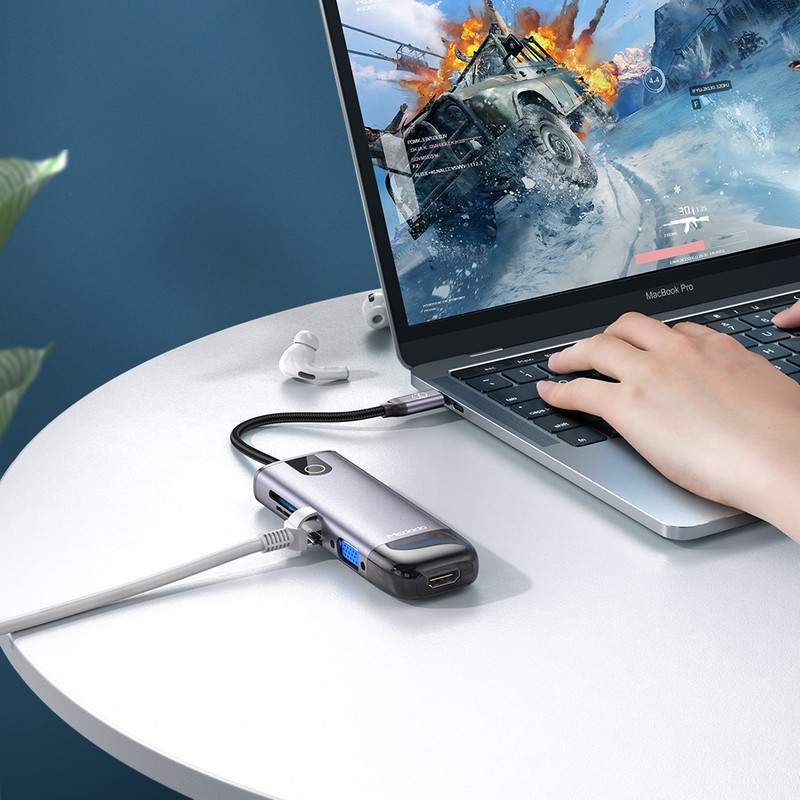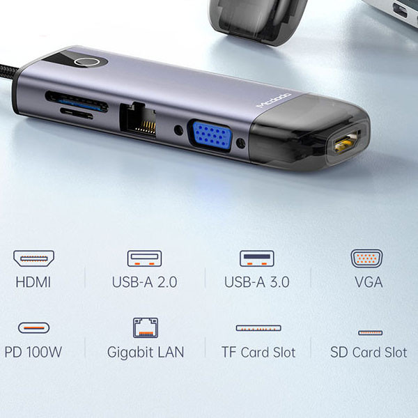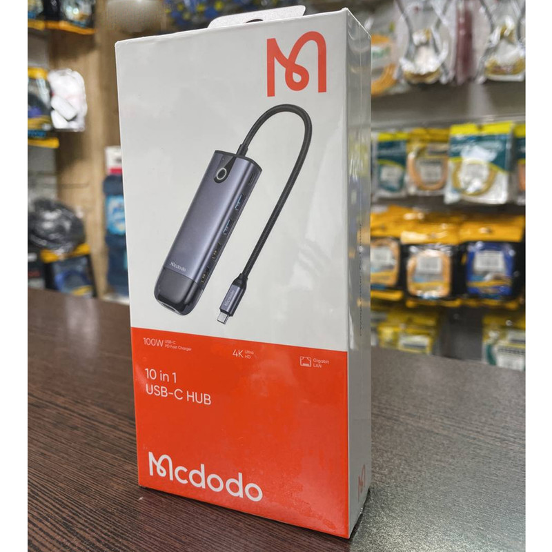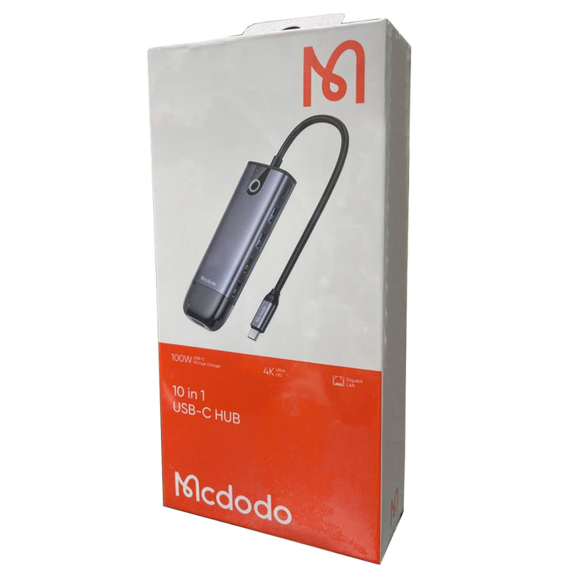 هاب 10 پورت USB-C مک دودو مدل HU-7420 چند کاره مک دودو دارای کانکتور USB-C بوده و قابلیت شارژ گوشی، انتقال داده و اتصال کارت SD را دارا می باشد.ابعاد هاب چند کاره Mcdodo HU-7420; برابر با 1.85×4.2×30 سانتی متر بوده و 90 گرم می باشد. بدنه آن از آلیاژ آلومینیوم و طول کابل آن 15 سانتی متر است.در اطراف بدنه این هاب 10 پورت متفاوت قرار گرفته که امکان شارژ با USB (4PORT) ، اتصال LAN RJ45 (10,100,1000M Gigabit)، اتصال HDMI 4K (3840x2160)و کارت حافظهSD/MicroSD و VGA را به کاربر می دهد.به کمک Type-c کاربر می تواند لپ تاپ یا هر وسیله دیگری را شارژ کند. حداکثر توان قابل انتقال به وسیله پورت PD برابر با 100 وات است.پورت تایپ سی این هاب فقط قابلیت شارژ دارد و برای انتقال اطلاعات نمی باشد.هاب مک دودو می تواند به درگاه تایپ سی لپ تاپ ها، تبلت ها و همینطور گوشی ها متصل شود و از سیستم های ویندور، Mac OS ، iPad OS و اندروید پشتیبانی می کند.